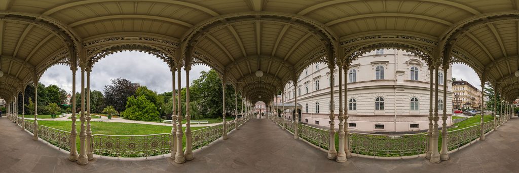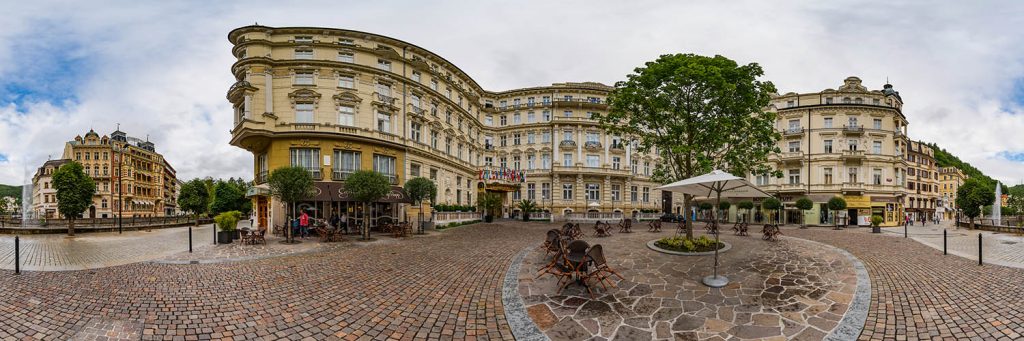 Dieses 360° Panorama wurde in der Fussgängerzone T.G. Masaryka in Karlsbad (Karlovy Vary) vor dem Grandhotel Ambassador und dem Restaurant Parlament aufgenommen.